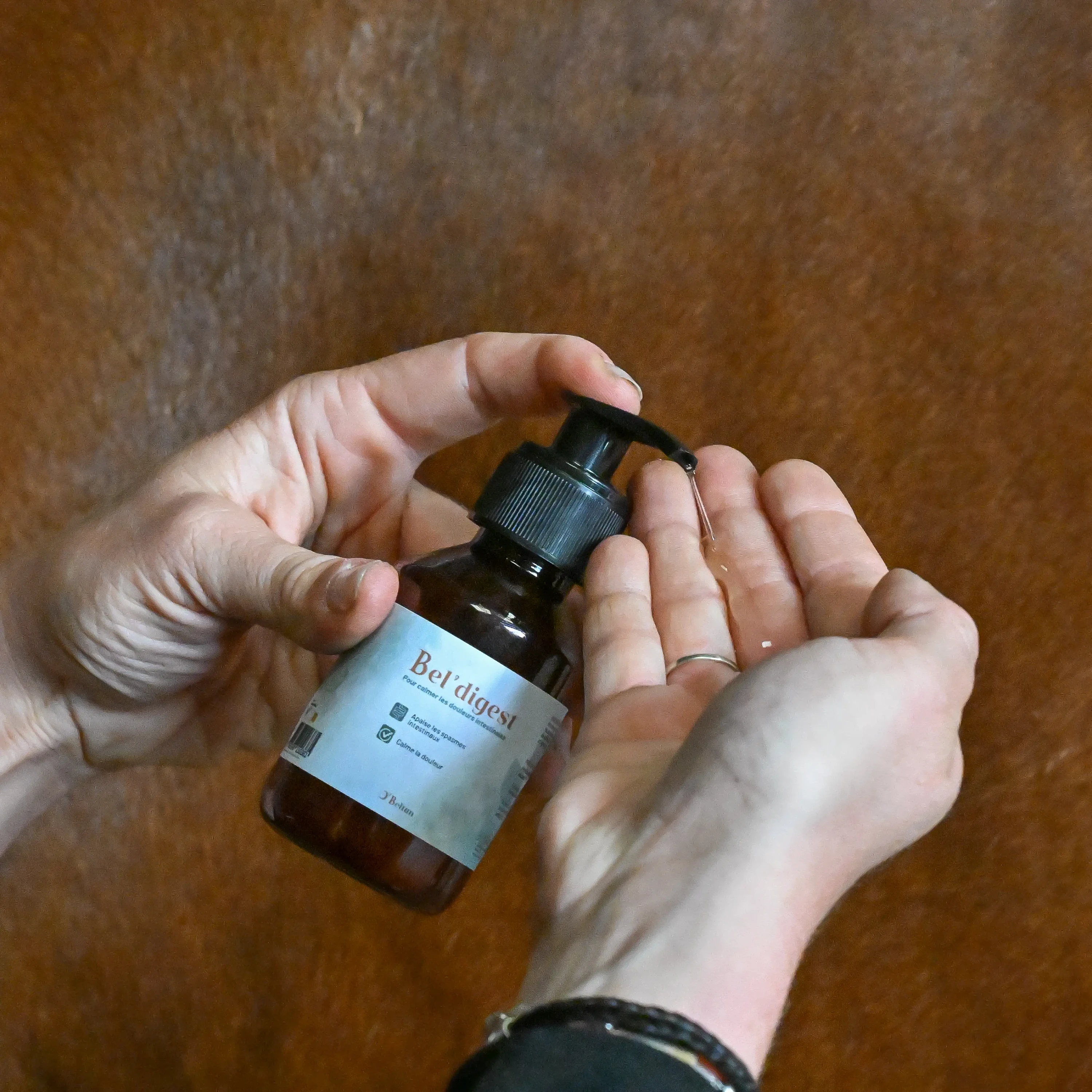 Appliquer une petite quantité de Bel’Digest sur le ventre du cheval (zone abdominale) en cas d'inconfort digestif.